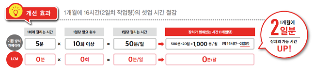 - 셋업 전환에 의한 로스 타임 감소 및 장비 가동률 향상
