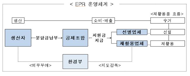 생산자책임재활용제도(Extended Producer Responsibility)는 생산자(제조·수입자)에게 폐기물을 회수해 재활용하는 의무를 부여하는 제도로, 현재는 냉장고, 세탁기, 포장재 등 43개 품목에 적용하고 있다. 현재 운영체계는 재활용 의무를 부담하는 생산자가 회수·재활용에 소요되는 비용(분담금)을 부담하고, 이를 선별업체·재활용업체에 지원금으로 제공하고 있다.