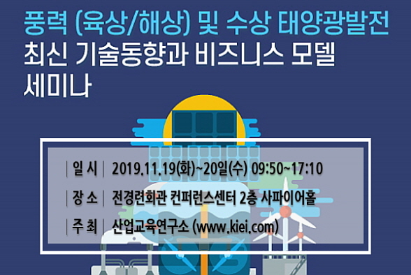 전 세계적으로 기후환경 변화와 환경이슈의 해결을 위해 재생에너지 기술개발 및 확대의 중요성이 해가 갈수록 커져가고 있고 우리나라 역시 재생에너지 산업 경쟁력ㆍ강화 방안 등 관련 산업 육성과 인프라 육성 및 조성을 위해 많은 노력을 기울이고 있는 가운데 산업교육연구소는 오는 11월 19일(화)부터 20일(수)까지 서울 여의도 전경련회관에서 풍력 (육상/해상) 및 수상 태양광발전 최신 기술동향과 비즈니스 모델 세미나를 개최한다고 밝혔다.