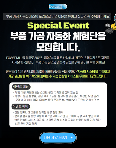 한국델켐(주)(이하 델켐)이 스페셜 이벤트로 부품 가공 자동화 체험단을 모집한다고 밝혔다. 파워밀(POWERMILL)을 필두로 30년간 금형 및 부품 제조 산업에서 최고의 스페셜리스트 자리를 지켜온 동사는 부품 가공 산업 경쟁력을 높이기 위해 이번 이벤트를 준비했다. 델켐 전문 엔지니어들은 이번 이벤트를 기반으로 고객사의 공장을 직접 찾아 자동화 시스템을 구축하는 한편, 가공 생산성을 획기적으로 높일 수 있는 컨설팅 서비스를 무료로 제공할 계획이다.