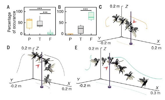 그림 2. 장수풍뎅이가 비행 중 장애물과 충돌하는 경우: (A) 장수풍뎅이가 비행 중에 날개 안쪽이 장애물과 부딪힌 경우, 장수풍뎅이는 대부분 장애물을 붙잡거나(P, perching) 추락함(T, tumble), (B) 날개 바깥쪽이 장애물과 충돌한 경우에는 대부분 비행을 계속할 수 있음 (F, flight), (C) 장수풍뎅이가 몸체 가까이에서 장애물과 충돌하는 경우의 거동, (D) 장수풍뎅이의 안쪽 날개가 장애물과 부딪히는 경우의 거동, (E) 장수풍뎅이의 바깥쪽 날개가 장애물과 부딪히는 경우의 거동 (사진. 건국대학교)