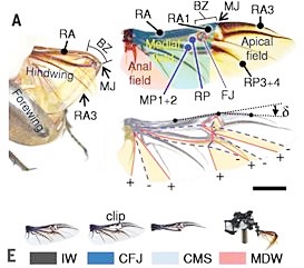 그림 1A는 장수풍뎅이의 뒷날개 구조와 접힌 형태를 도시하고, 그림 1E는 실험에 사용한 세가지 날개와 날갯짓 장치에 장착된 날개를 보여준다. 날개의 접힘부를 제거한 경우에는(그림 1E 두 번째) 날개의 접힘 형태를 유지할 수 없었고, 날개의 막이 모두 제거된 경우에는(세 번째) 날갯짓을 더 많이 해야 날개가 완전히 펼쳐졌다. 이로써 초기 날갯짓으로 발생하는 관성력과 공기력이 날개를 완전히 펼치는 원천임을 입증했다.