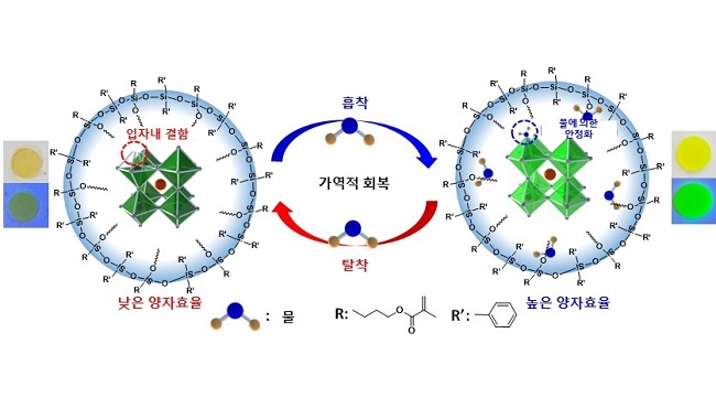 실록산으로 캡슐화된 페로브스카이트 나노 입자 수지는 제조과정 중 자외선 경화에 의해 발광 효율이 낮게 나타났지만 이후 다양한 화학적 환경 과 고온‧고습 환경(85℃/85%)에서도 원래의 높은 값(>70%)으로 회복되는 특이한 현상을 보였다. 또 물속에서도 600일 이상 유지되는 등 매우 우수한 발광 안정성을 보였다. 연구팀은 화학적 캡슐화 작업과 함께 페로브스카이트 나노 입자 복합체가 물에 의해 안정화되는 현상을 광‧물리학적으로 분석했으며, 이론적으로 그 메커니즘을 규명했다. 아울러, 공동연구팀은 디스플레이의 색 변환 층으로 성능을 확인한 결과 양자효율 및 색 재현율이 기존 퀀텀닷 대비 향상됐음을 밝혔다. 또한, 실록산 캡슐화를 통해 페로브스카이트 나노 입자 내의 납(Pb)의 독성을 막아줌으로써 생체친화적인 특성도 나타내 상용화를 추진하는데도 문제가 없음을 확인했다.