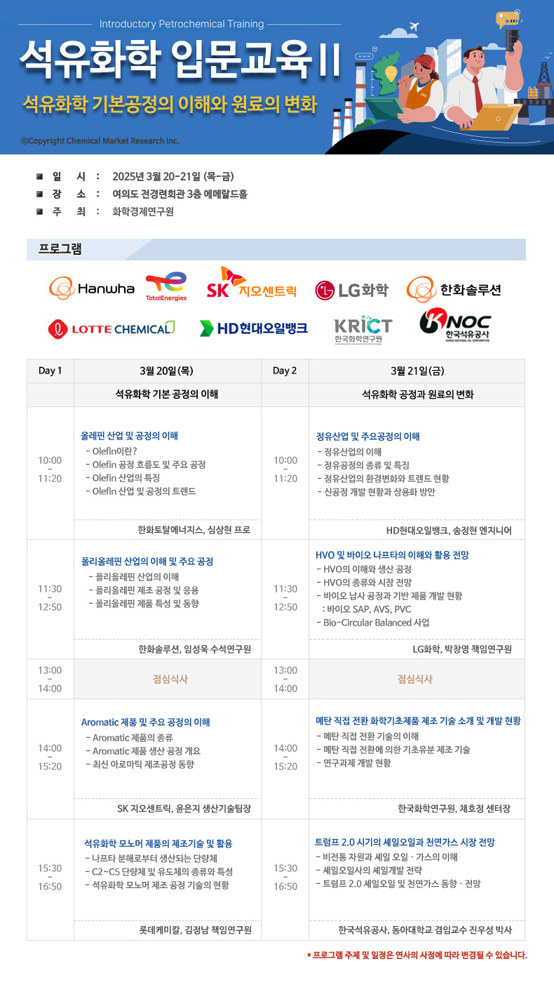 교육에서 다루는 주요 의제는 ▲Olefin 산업 및 공정 이해 ▲폴리올레핀 산업 이해 및 주요 공정 ▲Aromatic 제품과 최신 제조 공정 동향 ▲석유화학 모노머 제품 제조 기술 및 활용 ▲정유 산업 및 공정 트렌드 변화와 주요 이슈 ▲HVO 및 바이오 나프타 이해와 활용 전망 ▲메탄 직접 전환에 의한 기초 유분 제조 기술 개발 ▲트럼프 2.0 시대 셰일오일과 천연가스 시장 전망 등이다.