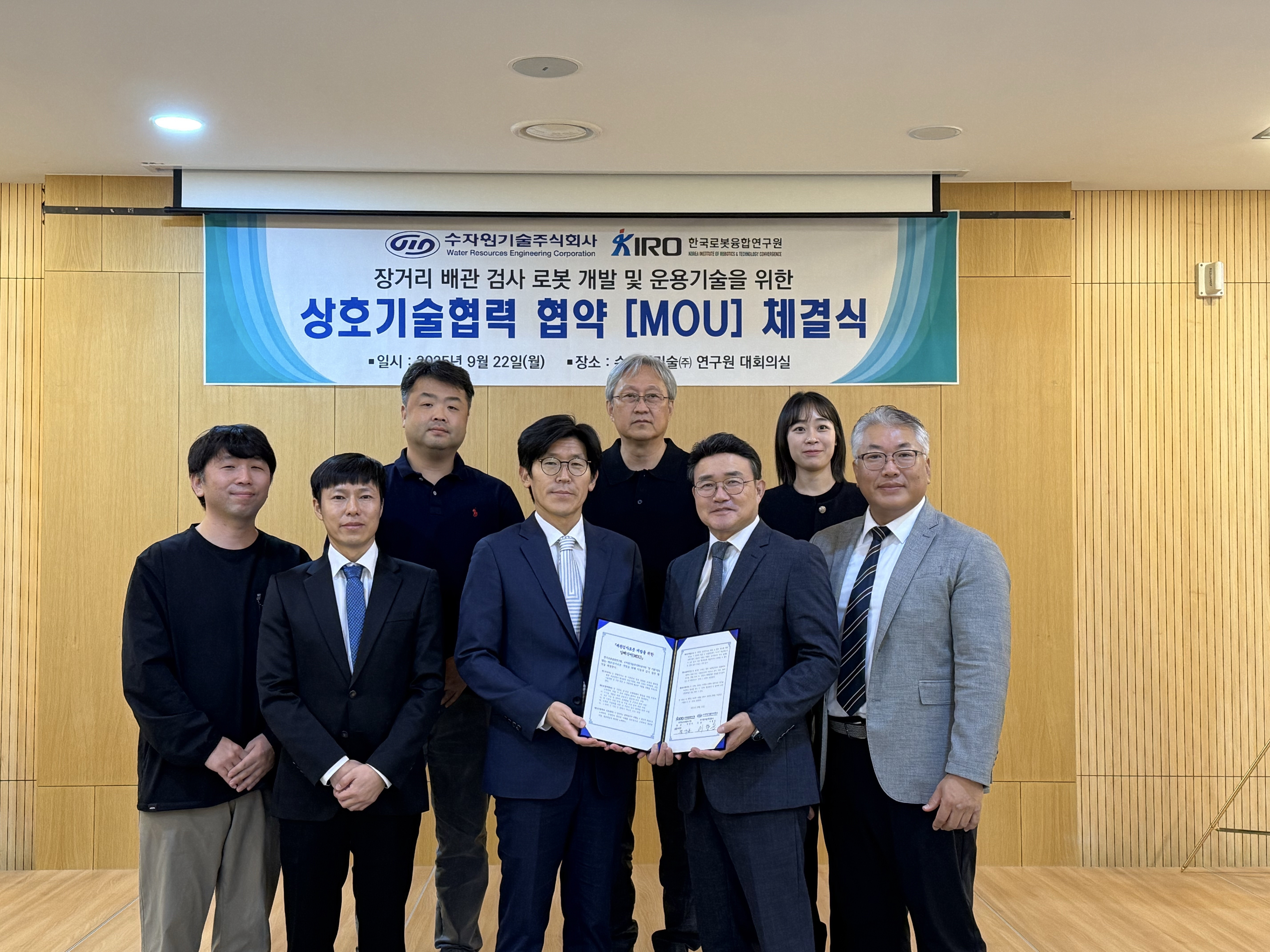 한국로봇융합연구원(이하 KIRO)과 수자원기술주식회사는 9월 22일(월) 대전 수자원기술주식회사 연구원 대회의실에서 배관검사로봇 공동 개발을 위한 업무협약(MOU)을 체결했다고 23일(화) 밝혔다.