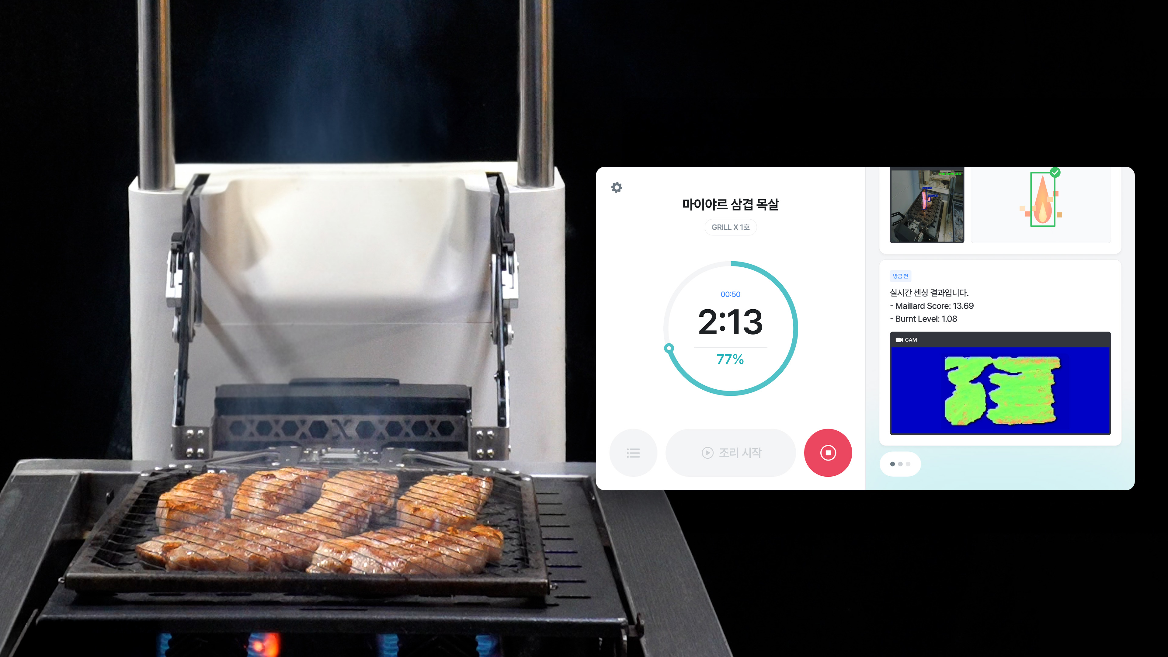 비욘드허니컴이 내세우는 또 하나의 축은 ‘피지컬 AI’다. 이는 단순히 프레스식으로 눌러 굽는 기계적 자동화가 아니다. 셰프가 재료를 올리고, 굽히고, 뒤집으며 상태를 읽는 동작을 로봇의 운동학과 제어에 그대로 옮겼다. 주방마다 다른 장비 높이와 기울기를 고려해 재료가 열원에 안정적으로 닿도록 만든 측면 반전 구조, 조리 중 과다 연기나 불꽃에 반응해 즉시 개입하는 비전 AI 기반 안전 제어가 대표적이다.