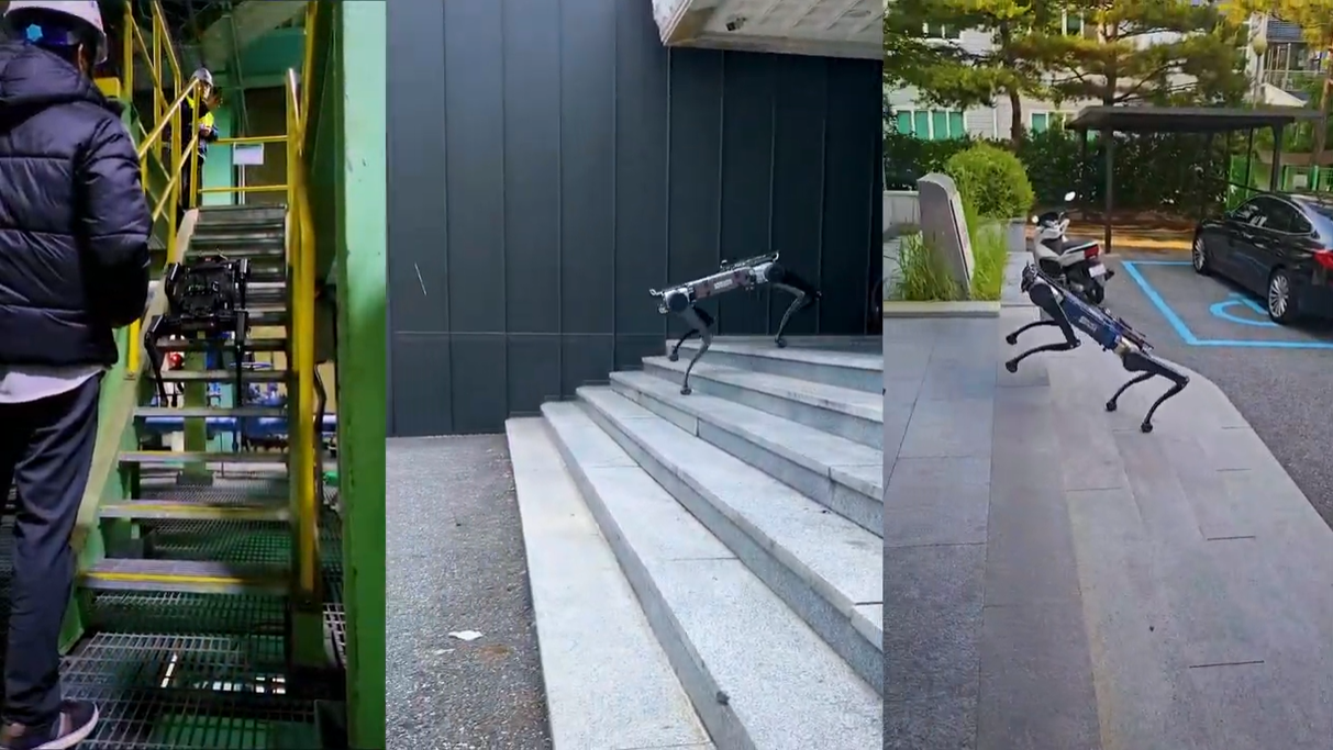 이번에 선정된 레인보우로보틱스의 RBQ 시리즈는 험지와 비정형 지형에서도 안정적으로 이동할 수 있는 고기동 4족보행 로봇 플랫폼으로, 동역학 기반 보행과 강화학습 기반 AI 보행을 유연하게 전환할 수 있는 것이 특징이다. 이를 통해 정교한 보행뿐 아니라 강건하고 동적인 움직임을 모두 구현할 수 있으며, 시각정보 없이도 AI 보행만으로 경사로와 계단을 오르는 것이 가능하다.
