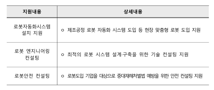 사업 공고 관련 문의는 한국로봇산업진흥원에서, 로봇 엔지니어링 컨설팅 문의는 한국생산기술연구원, 로봇 공급기업 문의는 한국AI·로봇산업협회로 진행하면 된다.