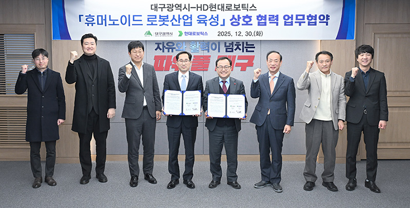 대구광역시(이하 대구시)가 12월 30일(화), 산격청사 제1대회의실에서 국내 로봇 기업 HD현대로보틱스와 ‘휴머노이드 로봇 산업 육성 및 생산 인프라 고도화’를 위한 업무협약(MOU)을 체결해 대구를 중심으로 한 휴머노이드 로봇 산업 생태계 조성에 본격 나선다.