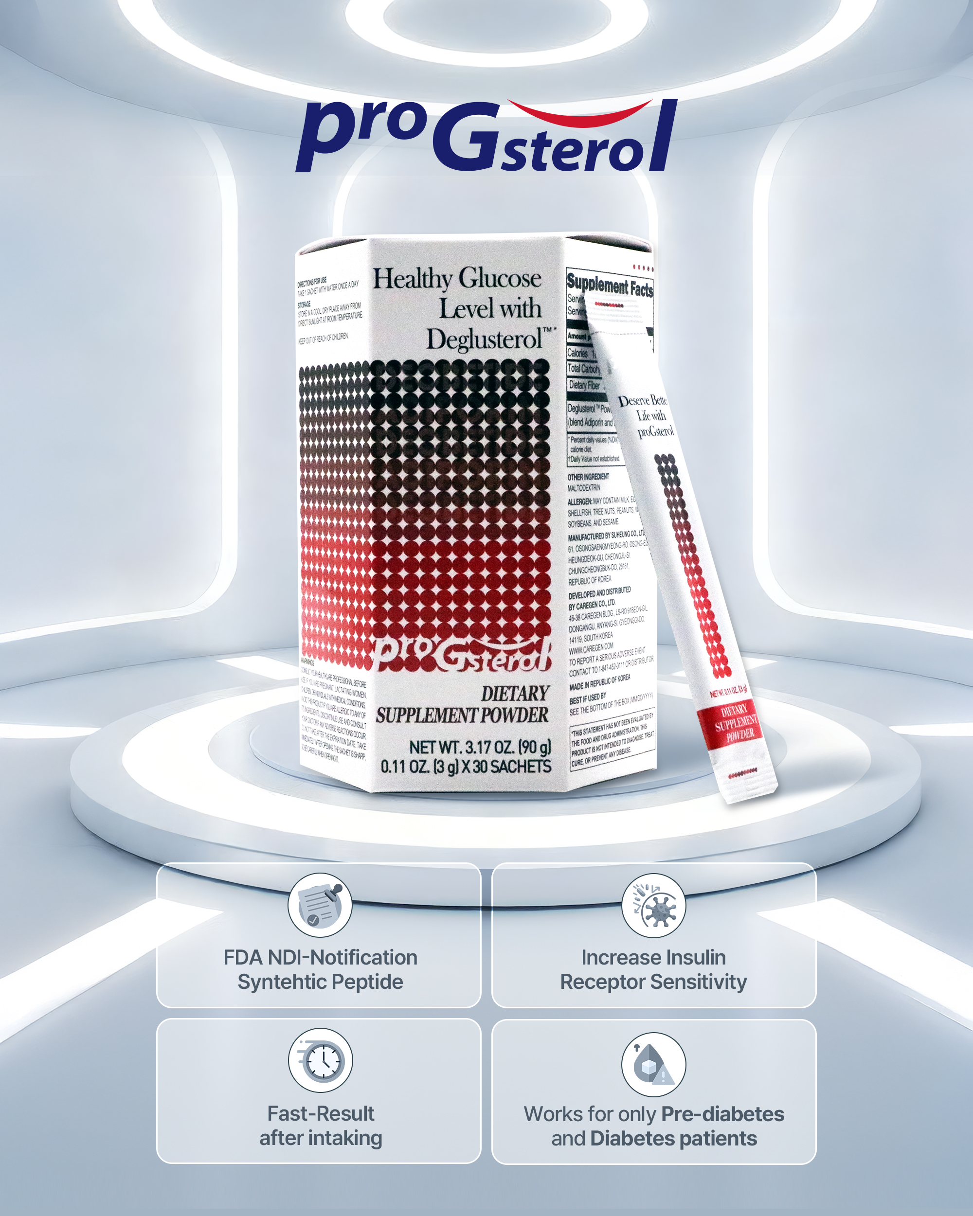프로지스테롤은 인슐린 저항성을 개선하고 인슐린 수용체 민감도를 높여 포도당 흡수 효율을 향상시키도록 설계된 합성 펩타이드다. 케어젠은 기존 당뇨 치료제와 달리 인슐린 분비를 직접 유도하지 않는 기전으로 저혈당 위험이 상대적으로 낮은 특성을 갖췄다고 설명했다. 임상시험에서는 복용 후 빠른 혈당 감소와 함께 식후 혈당이 안정적으로 유지되는 경향이 확인됐다고 밝혔다.