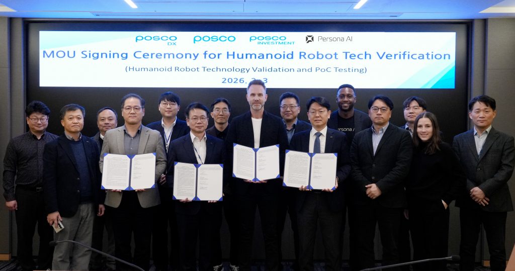 (주)포스코(이하 포스코)가 지난 2월 3일(화) (주)포스코DX(이하 포스코DX) 판교사옥에서 포스코, 포스코DX, 포스코기술투자(주)(이하 포스코기술투자), 미국 휴머노이드 로봇 기업 페르소나 AI(Persona AI)와 산업용 휴머노이드 로봇의 현장 적용을 위한 업무협약(MOU)을 체결했다. 이번 협약은 제철소 철강제품 물류관리 공정에 휴머노이드 로봇을 도입하기 위한 공동 검증과 기술 협력을 골자로 한다.